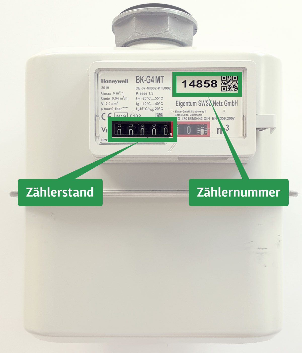 - Zur eindeutigen Zuordnung des Zählers wird eine individuelle Zählernummer vergeben. Über diese Zählernummer melden Sie sich für die Gasversorgung bei Ihrem Energielieferanten an.