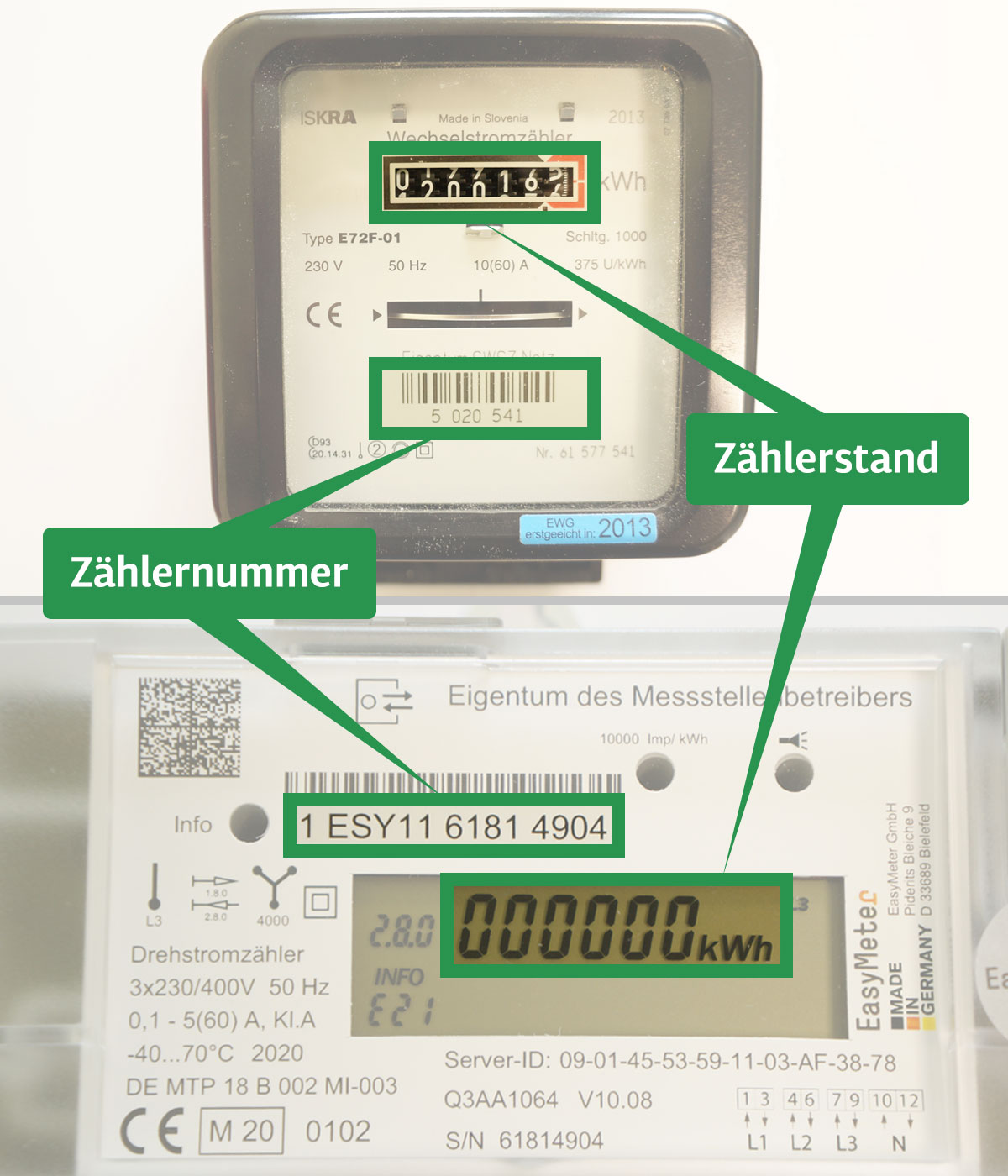 - Zur eindeutigen Zuordnung des Zählers wird eine individuelle Zählernummer vergeben. Über diese Zählernummer melden Sie sich für die Stromversorgung bei Ihrem Energielieferanten an.